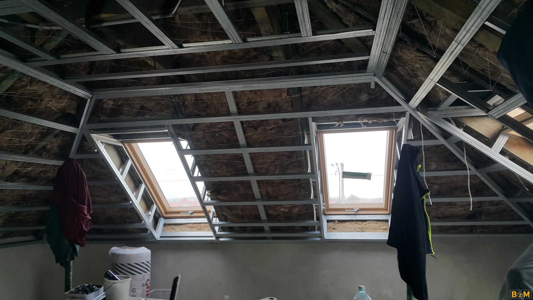 Docieplenie poddasza wełna mineralną, wykonanie pełnej zabudowy K-G i wyszpachlowanie całości. Po zagruntowaniu całość gotowa pod malowanie.